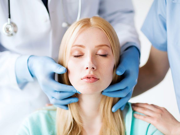 healthcare, medicine and people concept – surgeon or doctor checking up patient lymph nodes