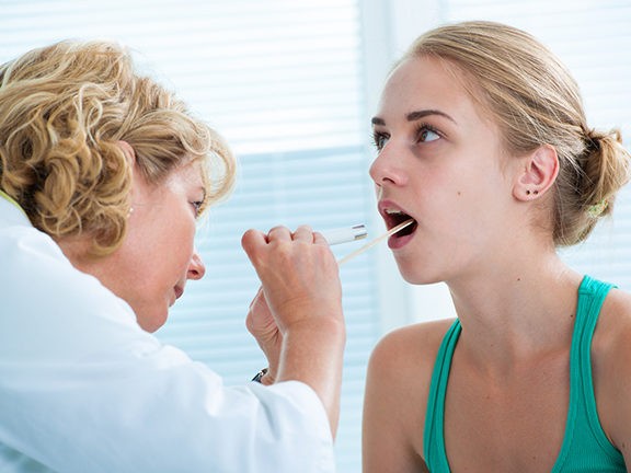 Doctor checking with depressor sore throat to teenage girl