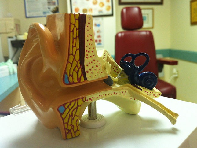 Sculpture of an inner ear cross section. Doctor’s office in background.